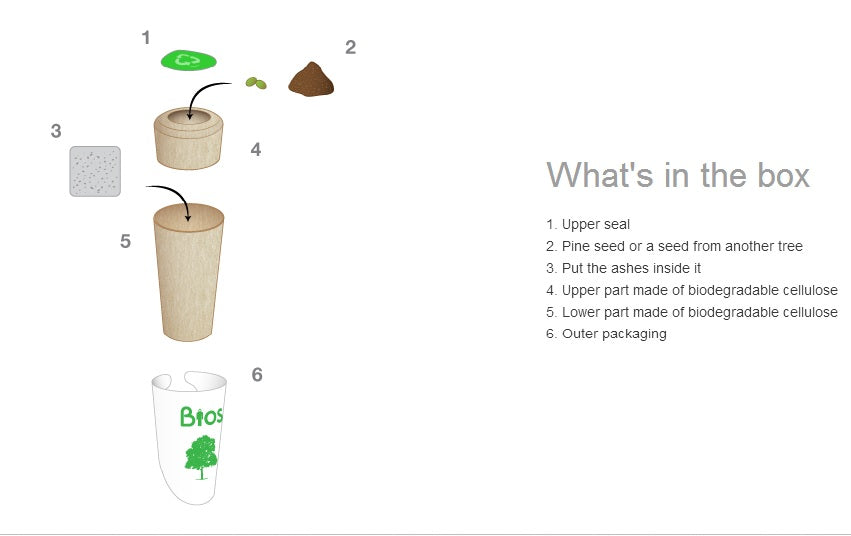L'urne bios transforme le rituel funéraire de l'enterrement en régénération et en retour à la vie par le biais de la nature. Quand l'urne est plantée, la graine germe et commence à pousser. Les cendres se transforment en arbre.