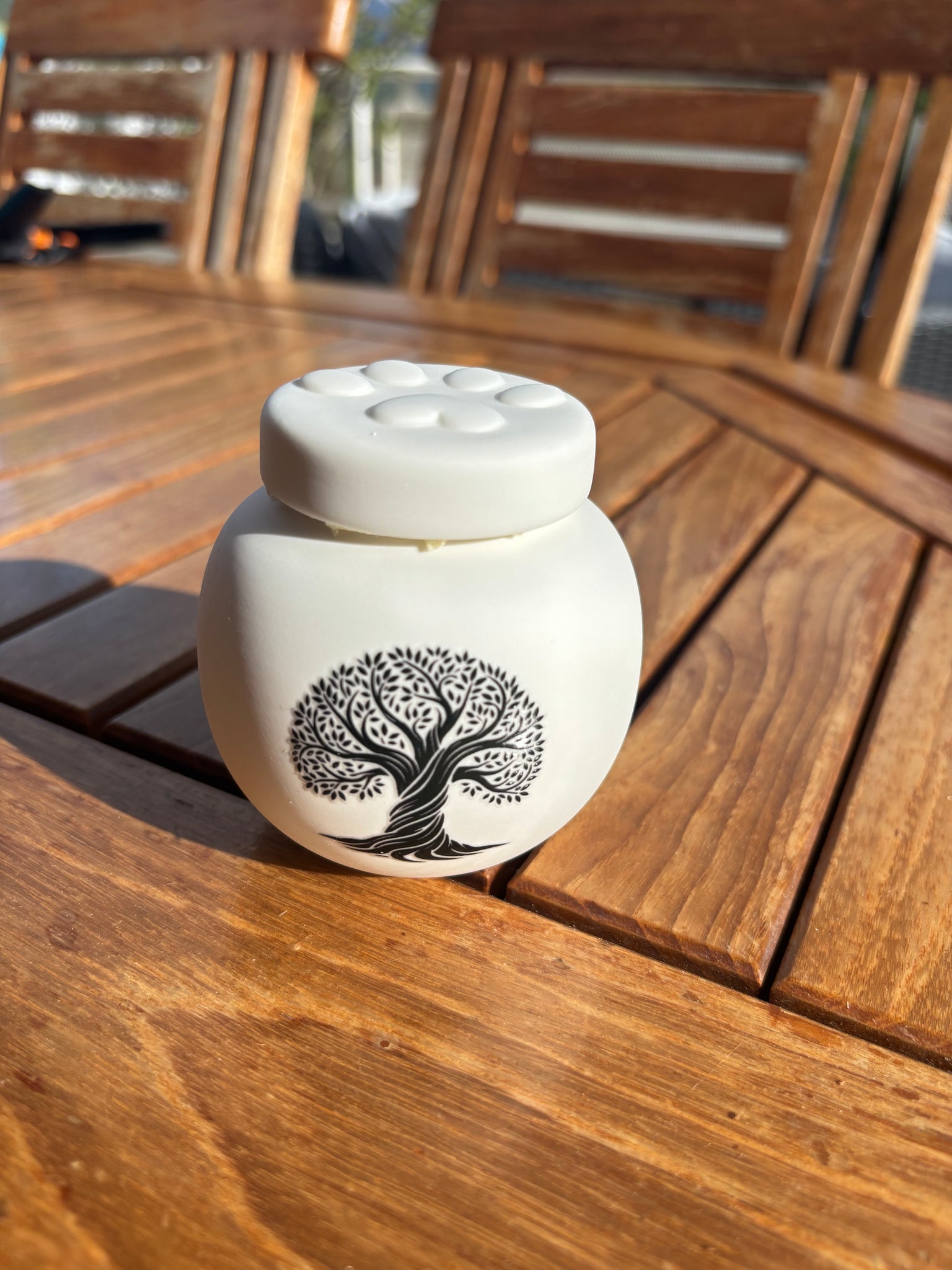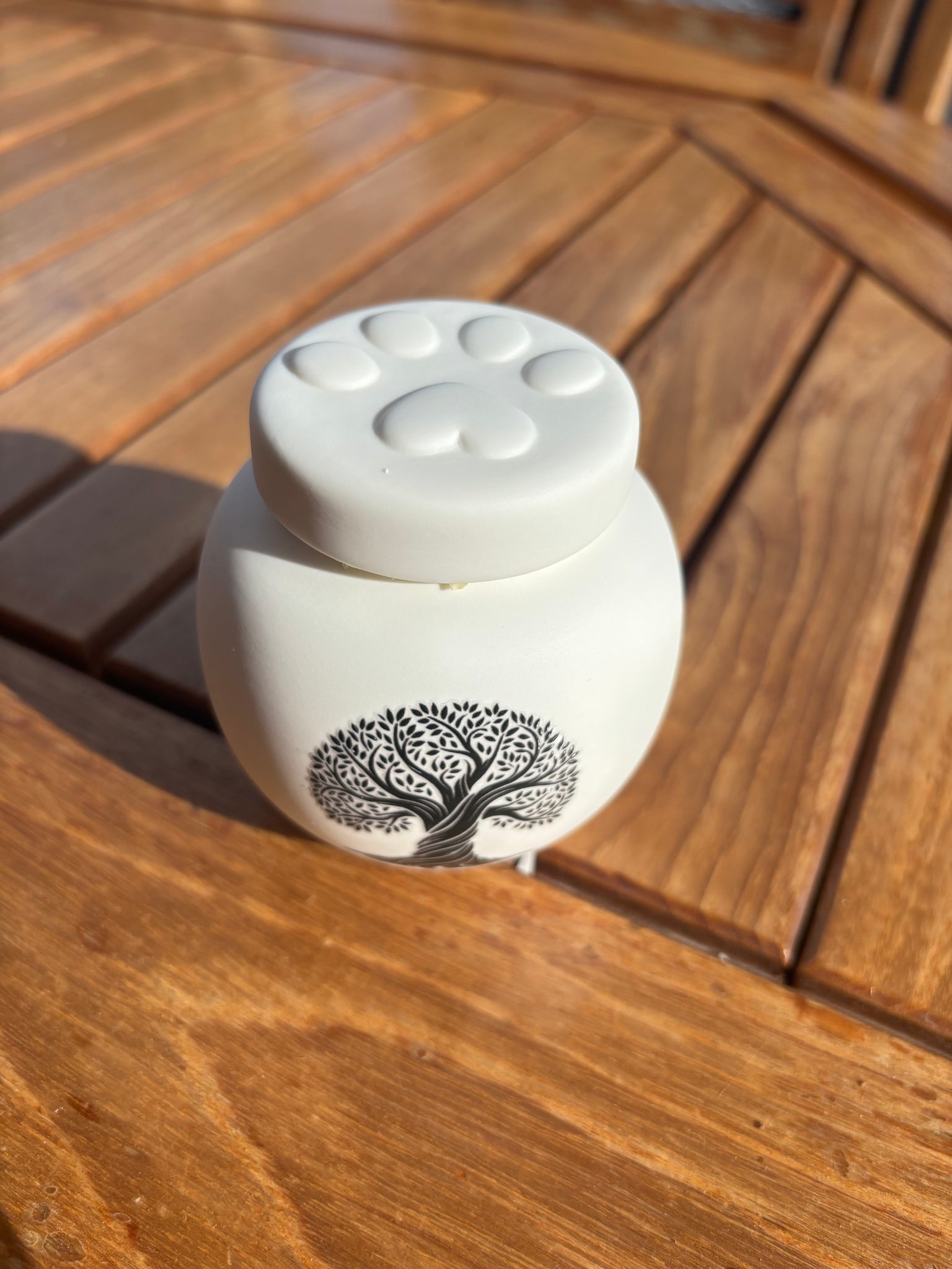 Cette urne funéraire en céramique a été conçue pour pouvoir contenir les cendres d’un animal pesant moins de 7 kg de son vivant.