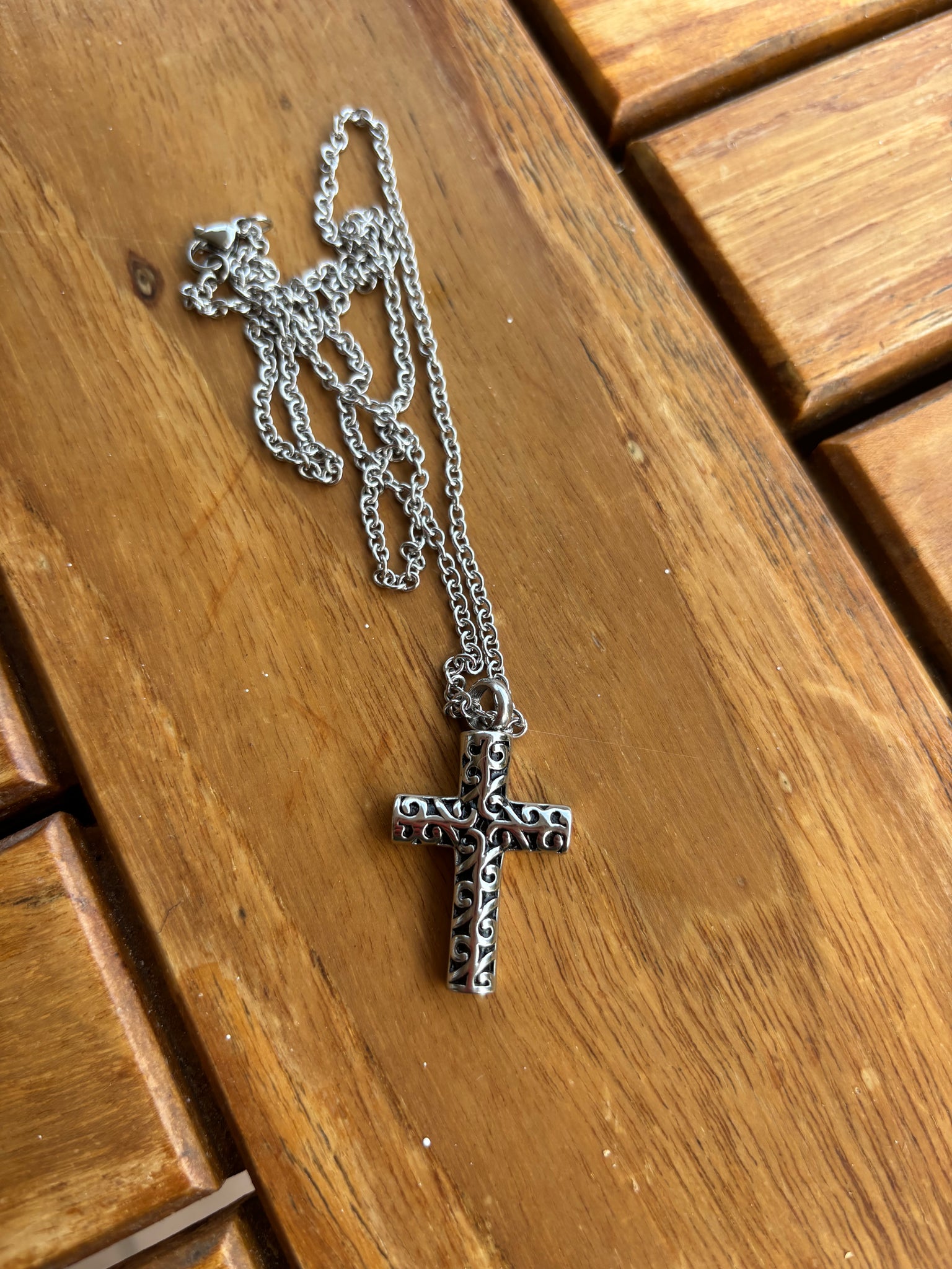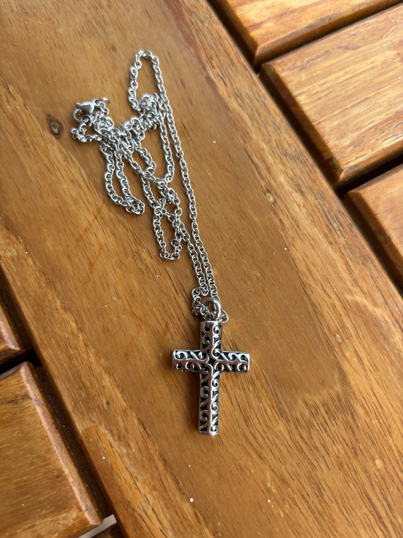 Réalisé en acier inoxydable résistant, il présente une forme de croix ornée de motifs gravés qui lui confèrent élégance et symbolisme.