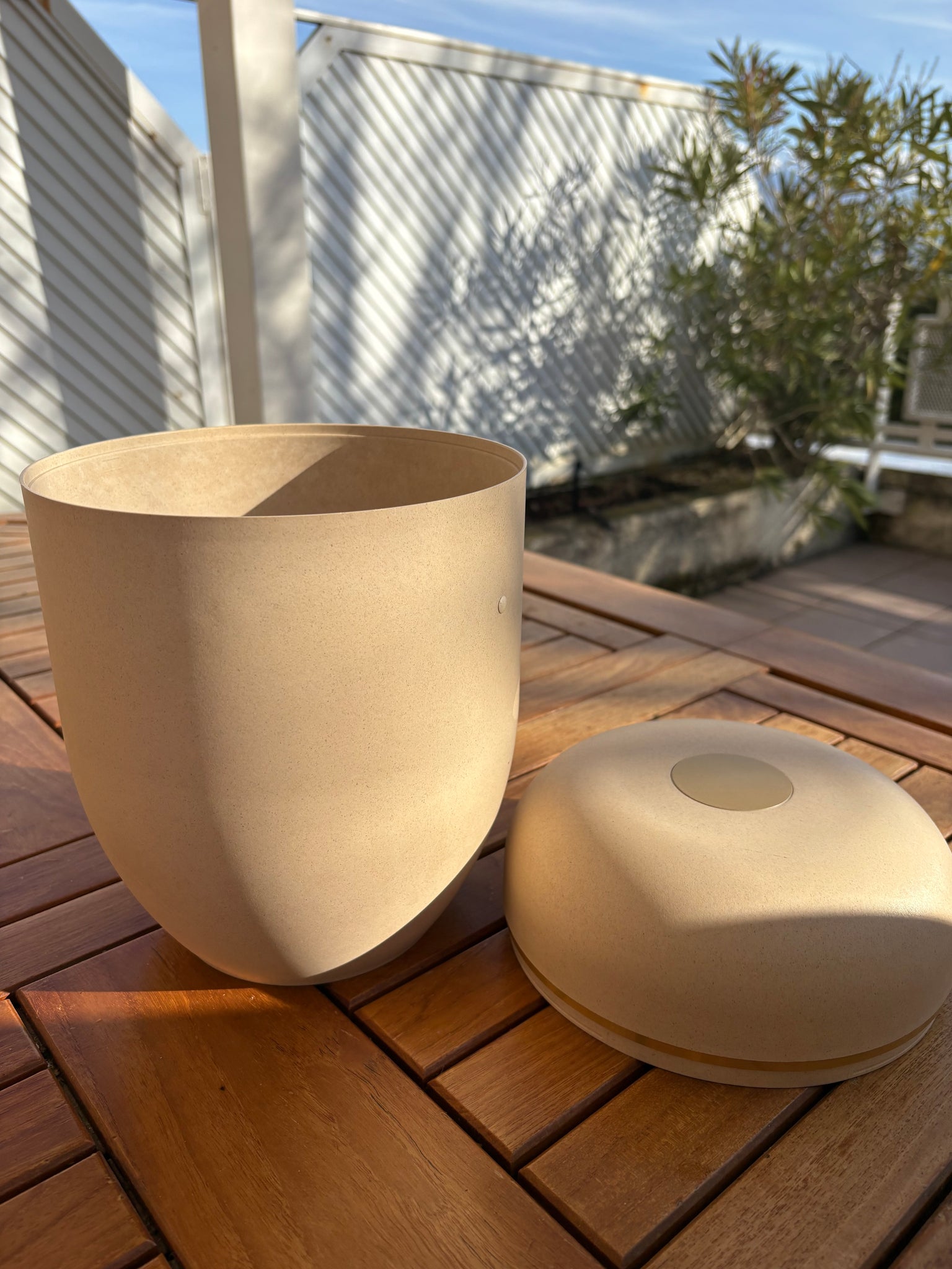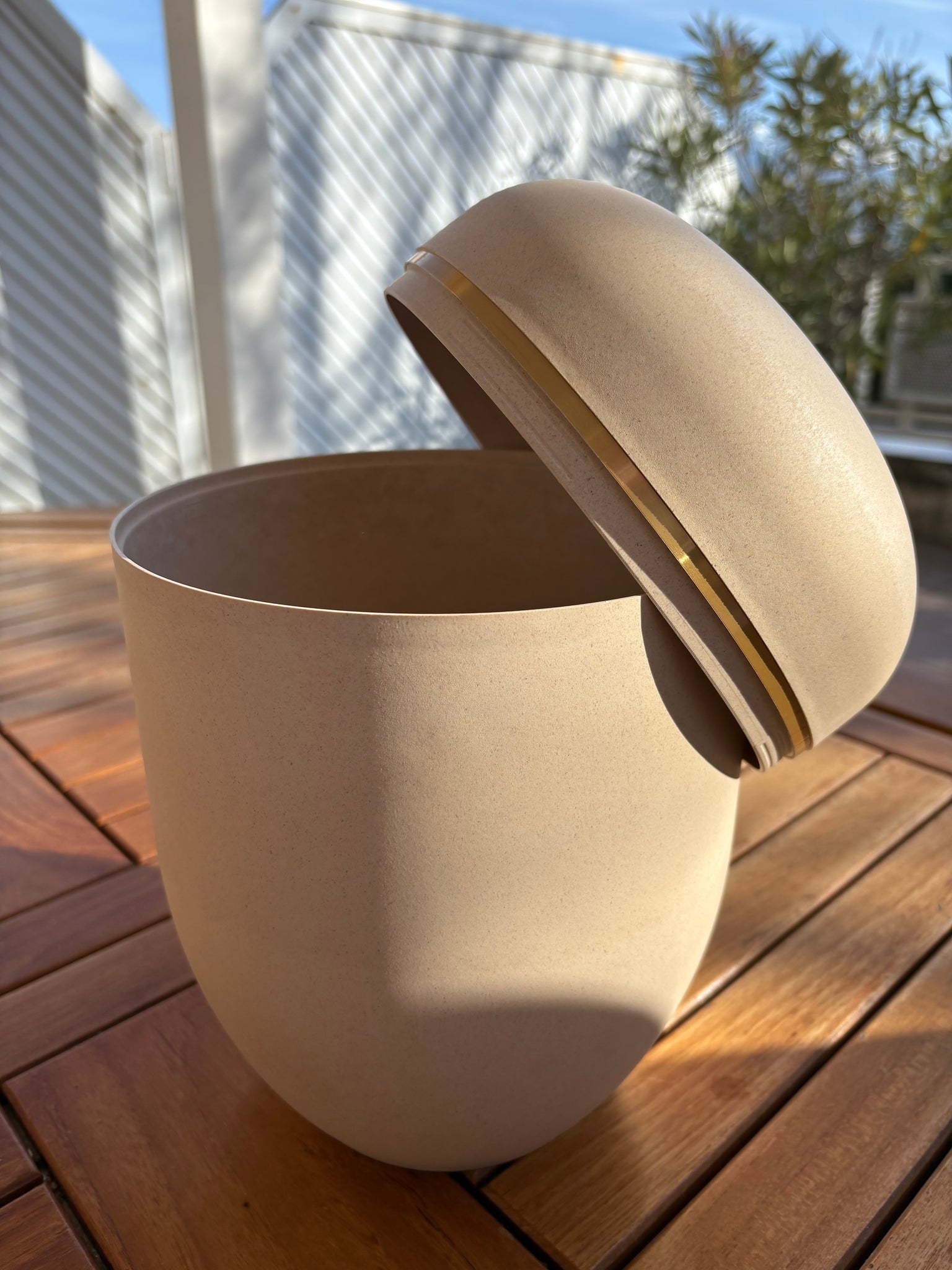 L’Urne composite beige avec liseré doré se distingue par son design sobre et contemporain, pensé pour rendre hommage avec dignité et discrétion. Sa finition beige douce et lumineuse, rehaussée d’un liseré doré délicat, associée à un couvercle incliné aux lignes harmonieuses, apporte une présence apaisante et empreinte de sérénité.