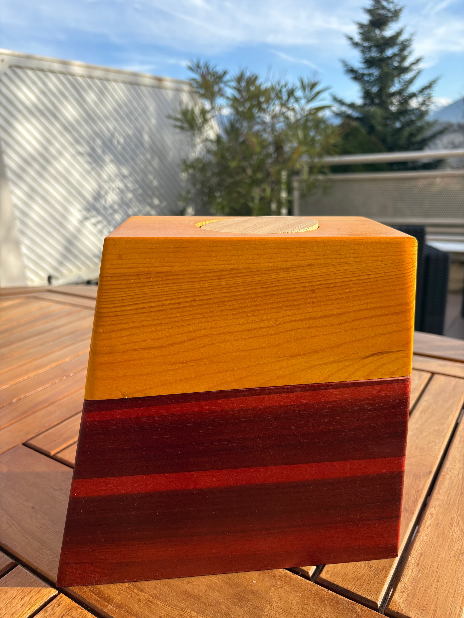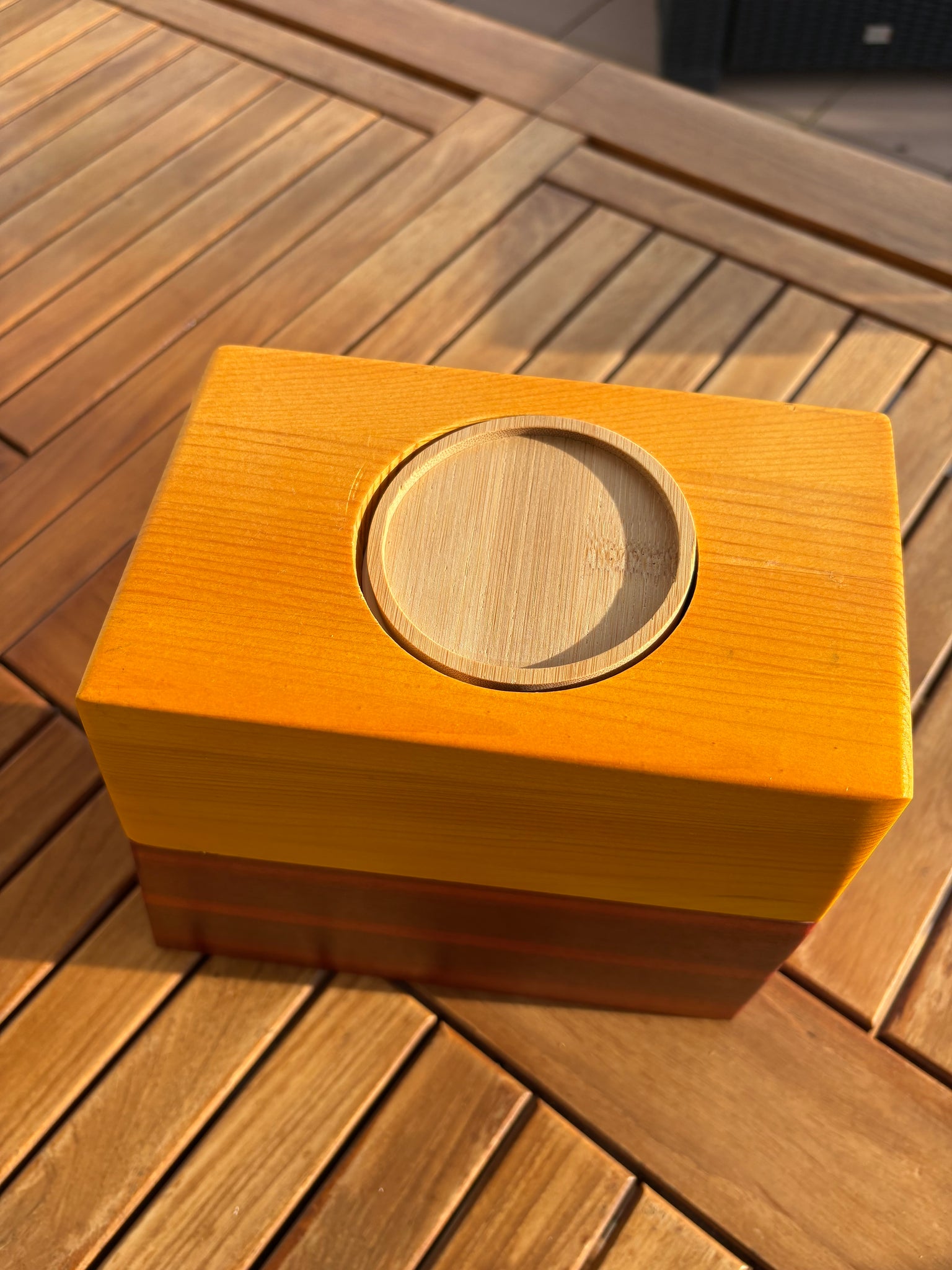 L’Urne Flower Bois est une urne funéraire en bois naturel, conçue pour offrir un hommage à la fois sobre, apaisant et vivant. Son design épuré, aux deux teintes de bois contrastées (clair et foncé), met en valeur la noblesse du matériau et s’intègre harmonieusement dans tout espace de recueillement.