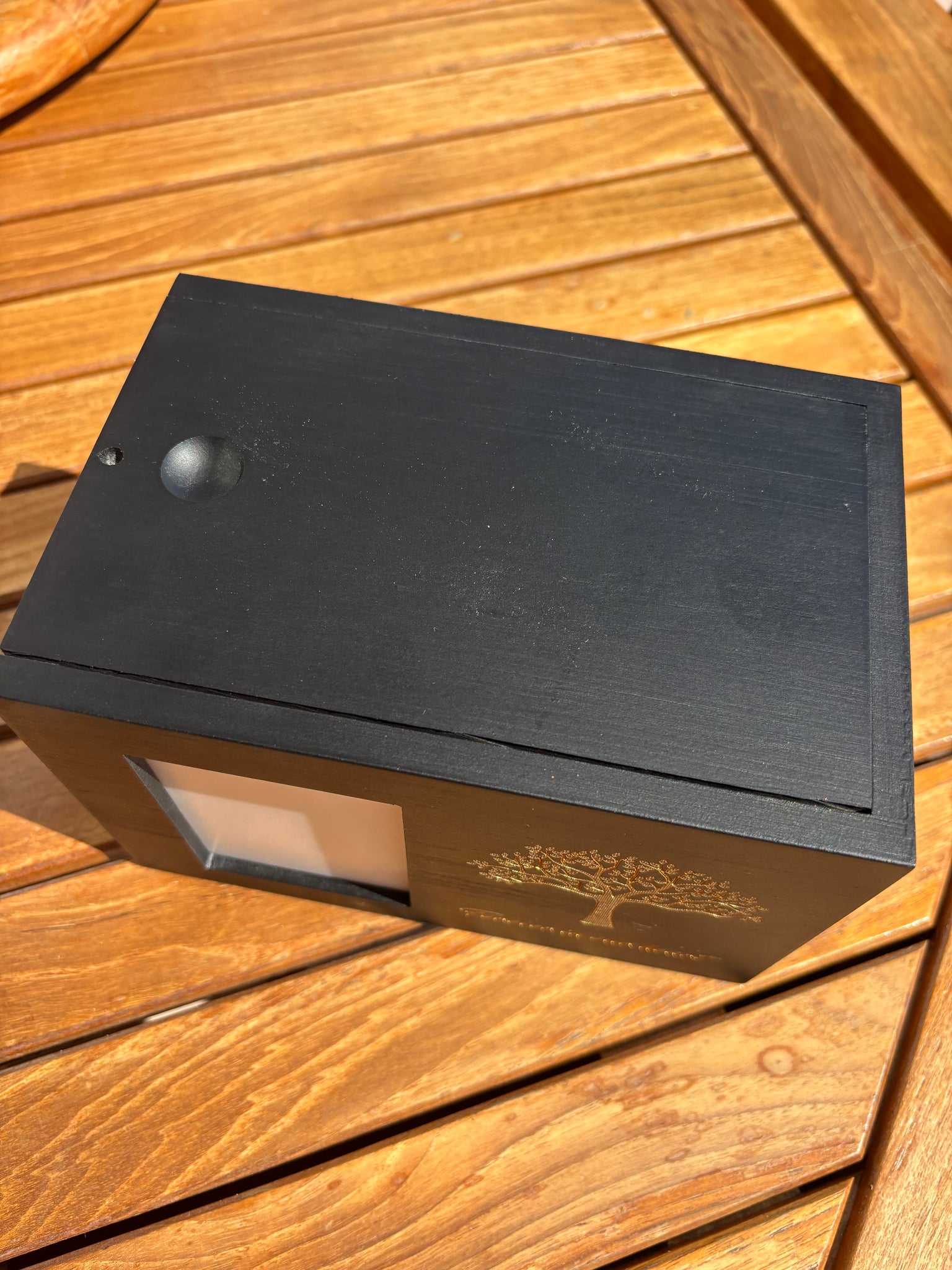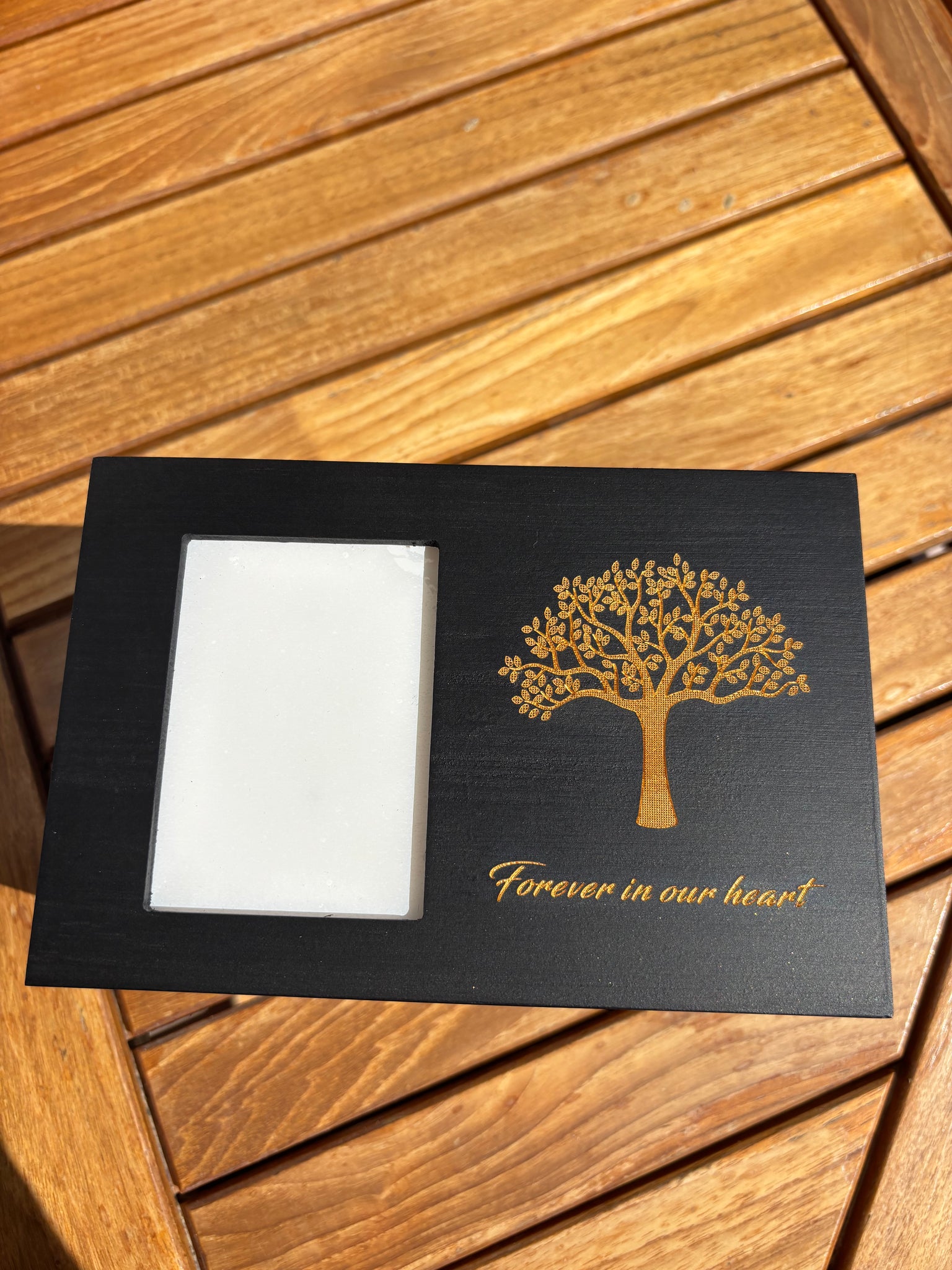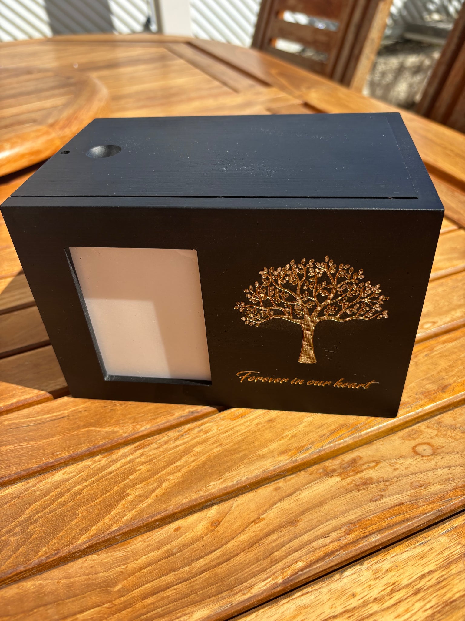 Fabriquée en bois, cette urne photo est un joli produit souvenir pour rendre hommage à votre chien ou chat perdu. Elle permet non seulement de conserver les cendres, mais aussi d'autres objets qui vous semblent importants, par exemple, une mèche de cheveux, ou un collier.